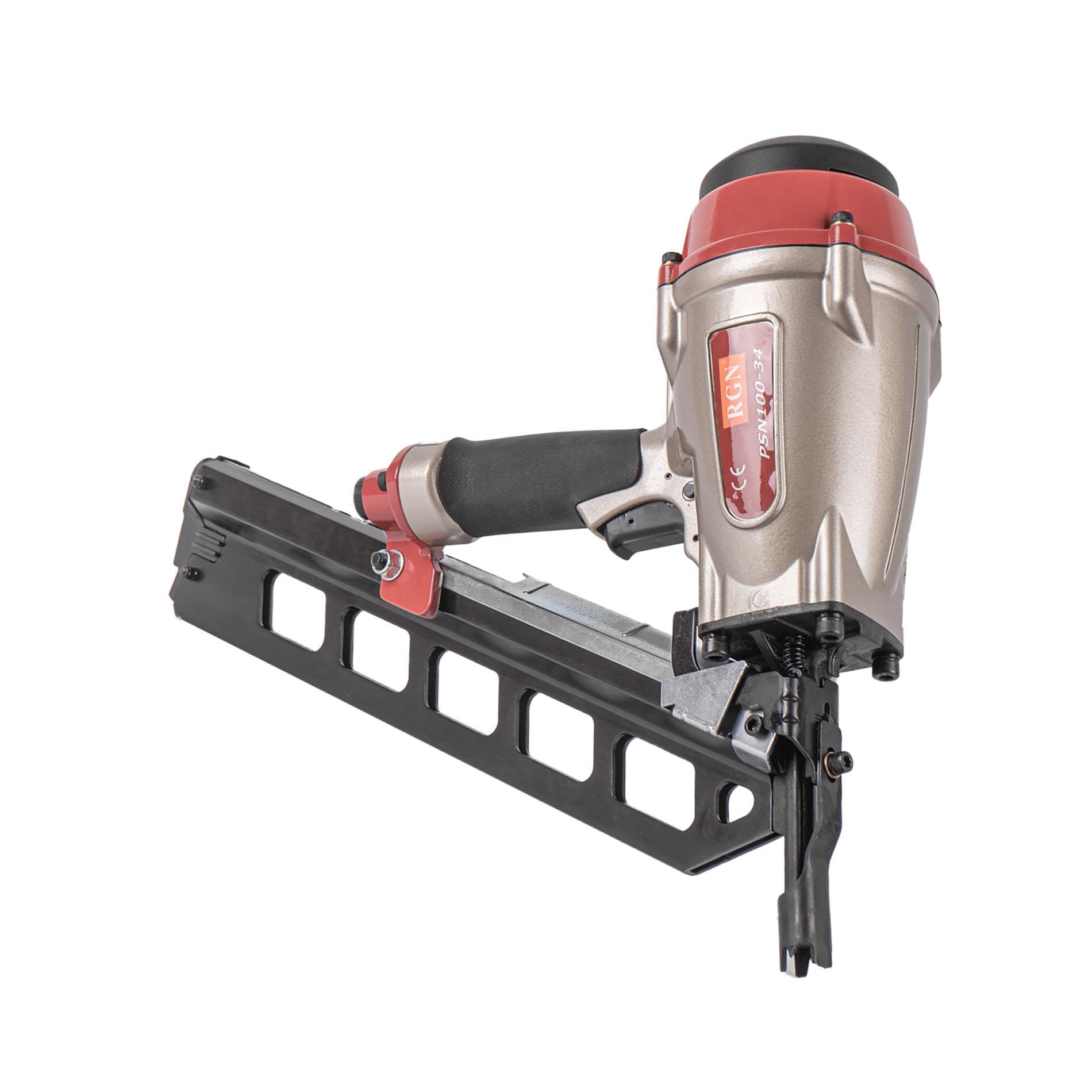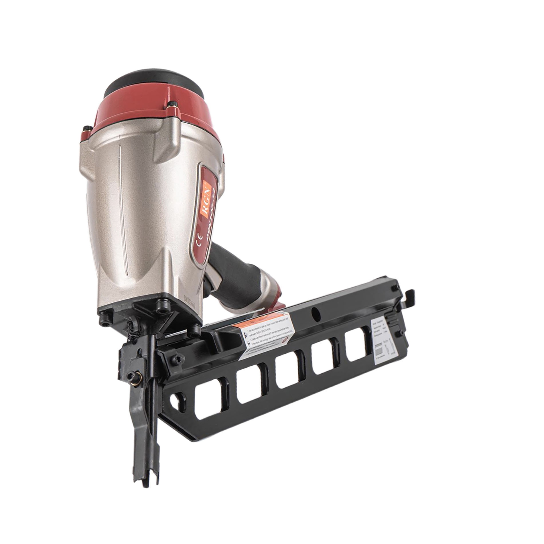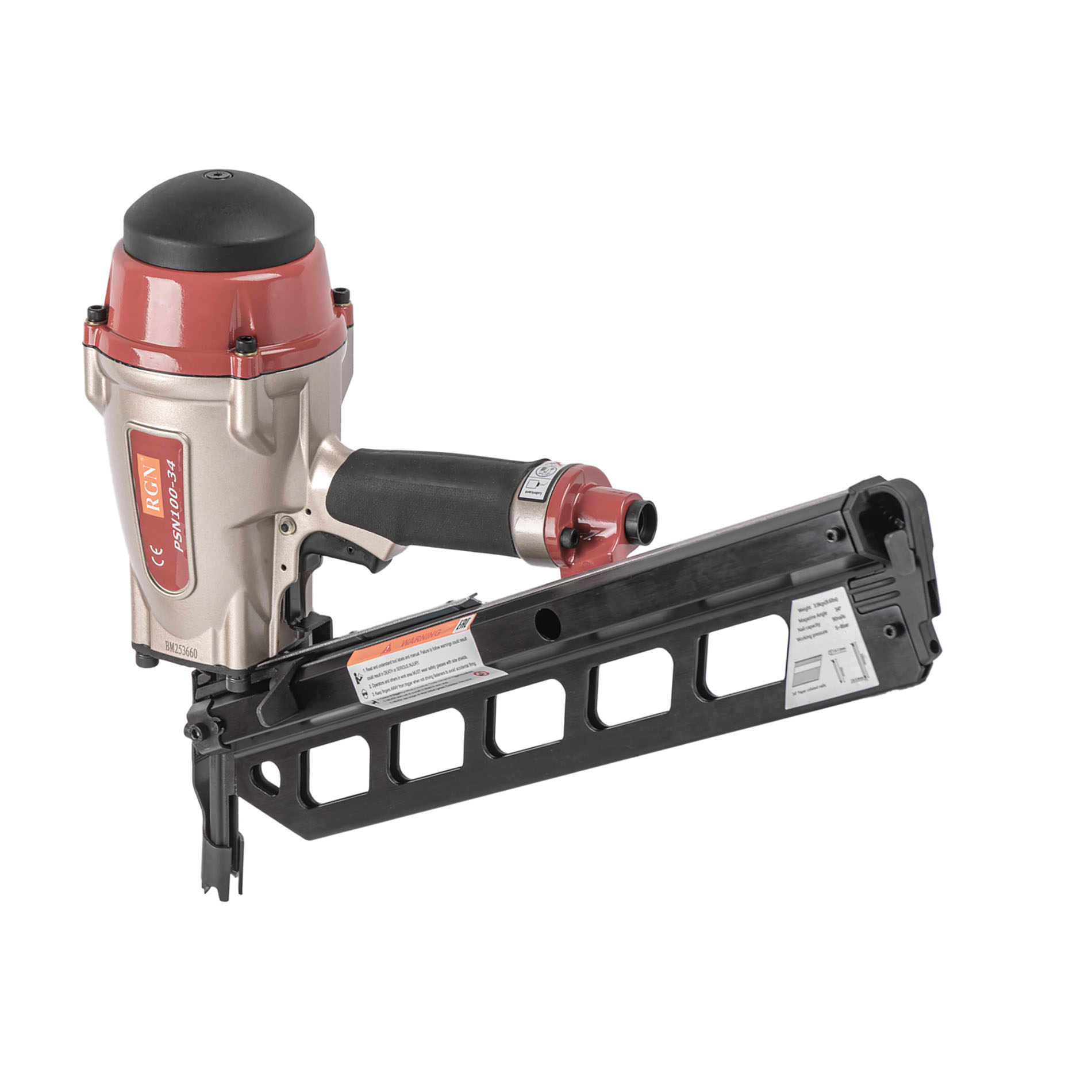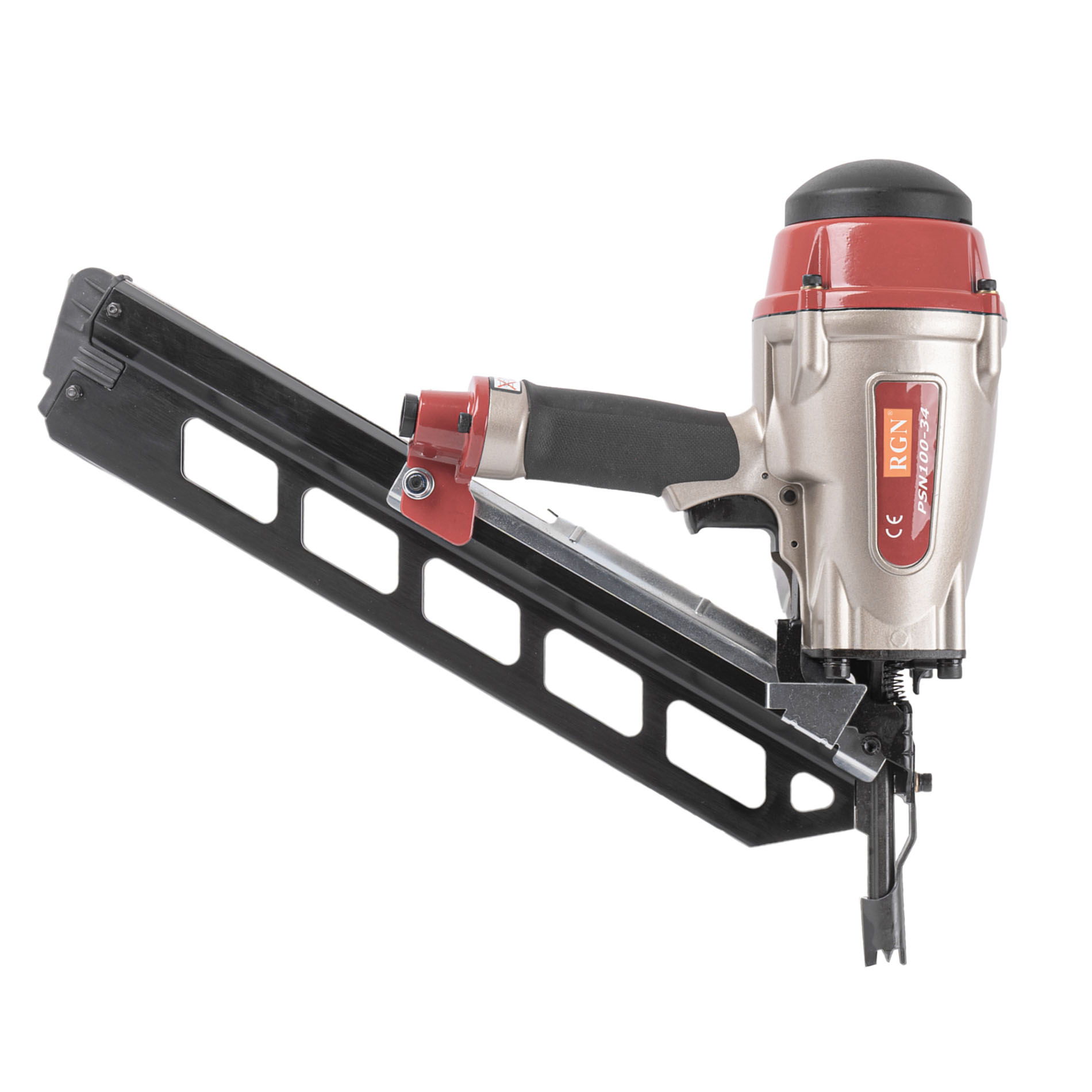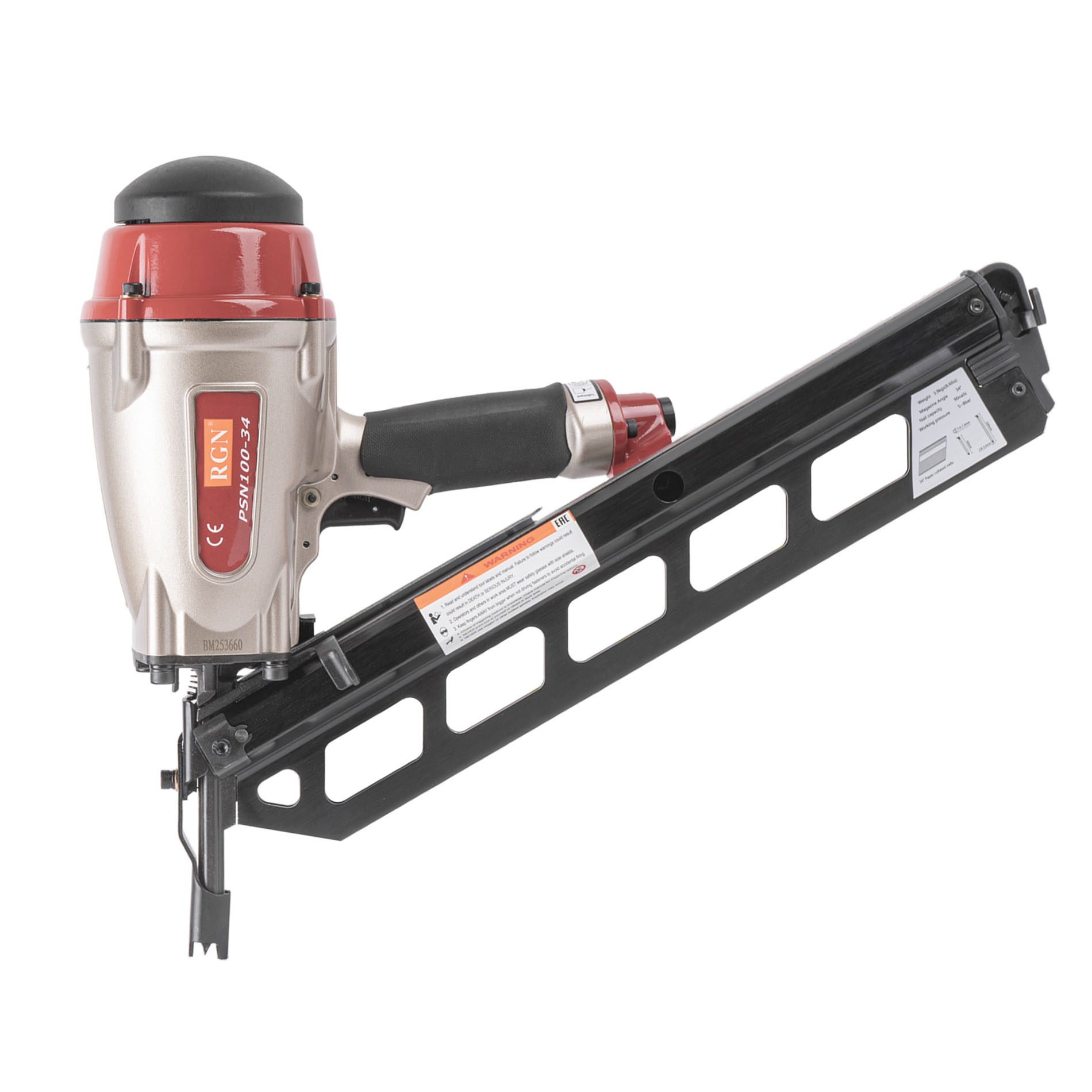 Гвоздезабивной пневматический реечный пистолет RGN PSN100-34 для реечных гвоздей в пластиковой обойме с углом наклона 34°, длиной 50, 60, 70, 80, 90, 100 мм. Инструмент идеально подойдет для применения в деревянном и каркасном домостроении. Емкость реечного магазина 90 гвоздей, это сравнительно немного и именно поэтому масса снаряженного гвоздями пистолета невелика, что позволяет чрезвычайно удобно оперировать им в труднодоступных местах, из неудобного положении и на вытянутых руках. Инструмент чрезвычайно надежен и прост, его эксплуатация не требует специальных знаний и навыков. Зубчатые зацепы носика предотвращают его "соскальзывание" с пристреливаемой поверхности, контактный предохранитель исключающий случайный выстрел, регулировка глубины забивания.