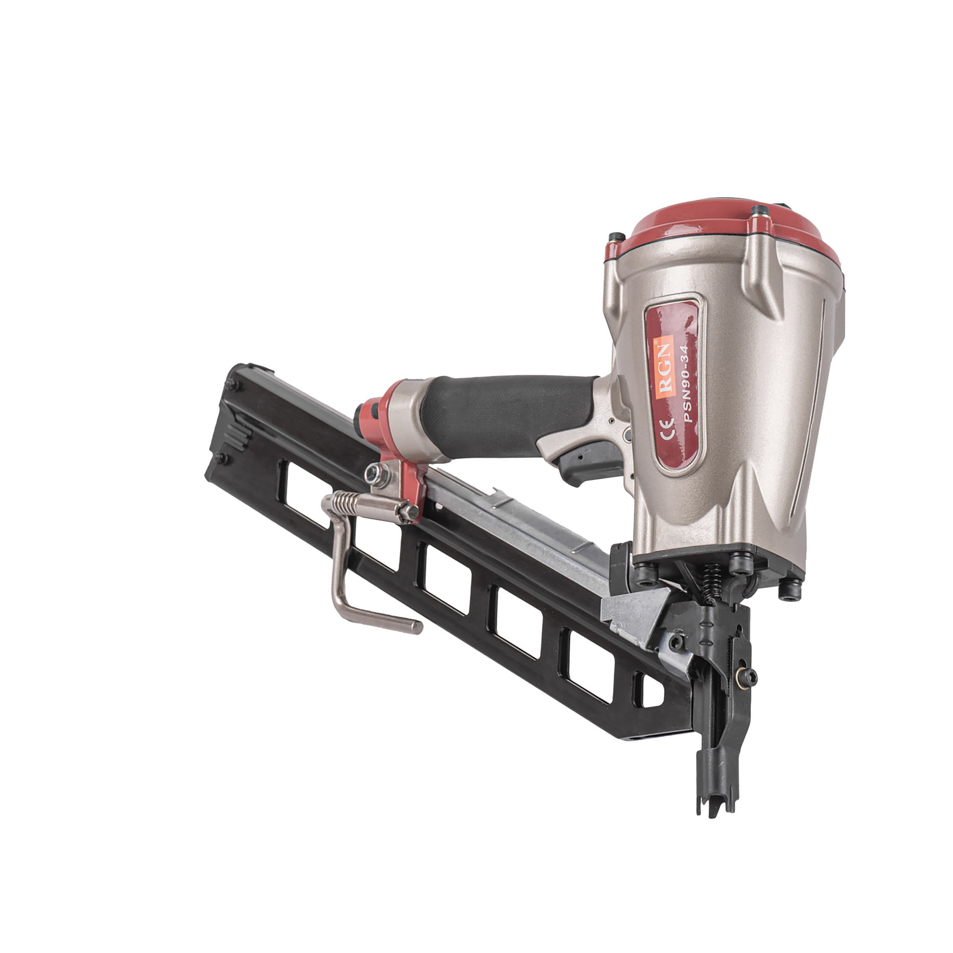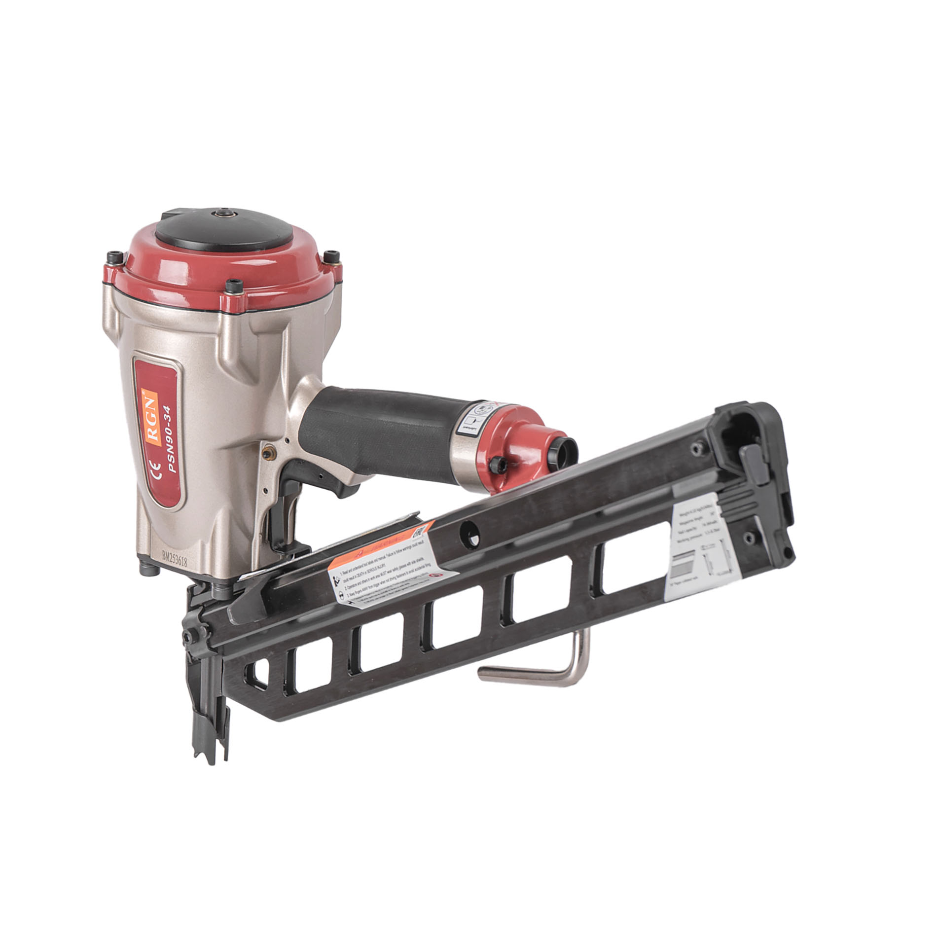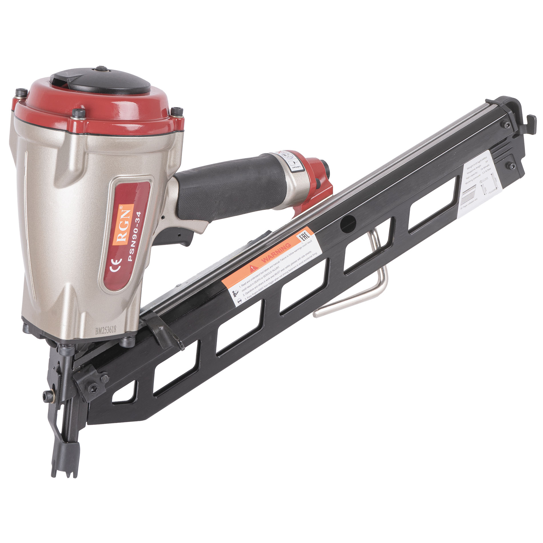 Гвоздезабивной пневматический реечный пистолет RGN PSN9034 для реечных гвоздей в пластиковой обойме с углом наклона 34° и длиной 50-83 мм. Инструмент идеально подойдет для применения в деревянном и каркасном домостроении. Емкость реечного магазина 94 гвоздя, это сравнительно немного и именно поэтому масса снаряженного гвоздями пистолета невелика, что позволяет чрезвычайно удобно оперировать им в труднодоступных местах, в неудобном положении и на вытянутых руках. Инструмент чрезвычайно надежен и прост, его эксплуатация не требует специальных знаний и навыков. Зубчатые зацепы носика предотвращающие его "соскальзывание" с пристреливаемой поверхности, контактный предохранитель исключающий случайный выстрел, регулировка глубины забивания.