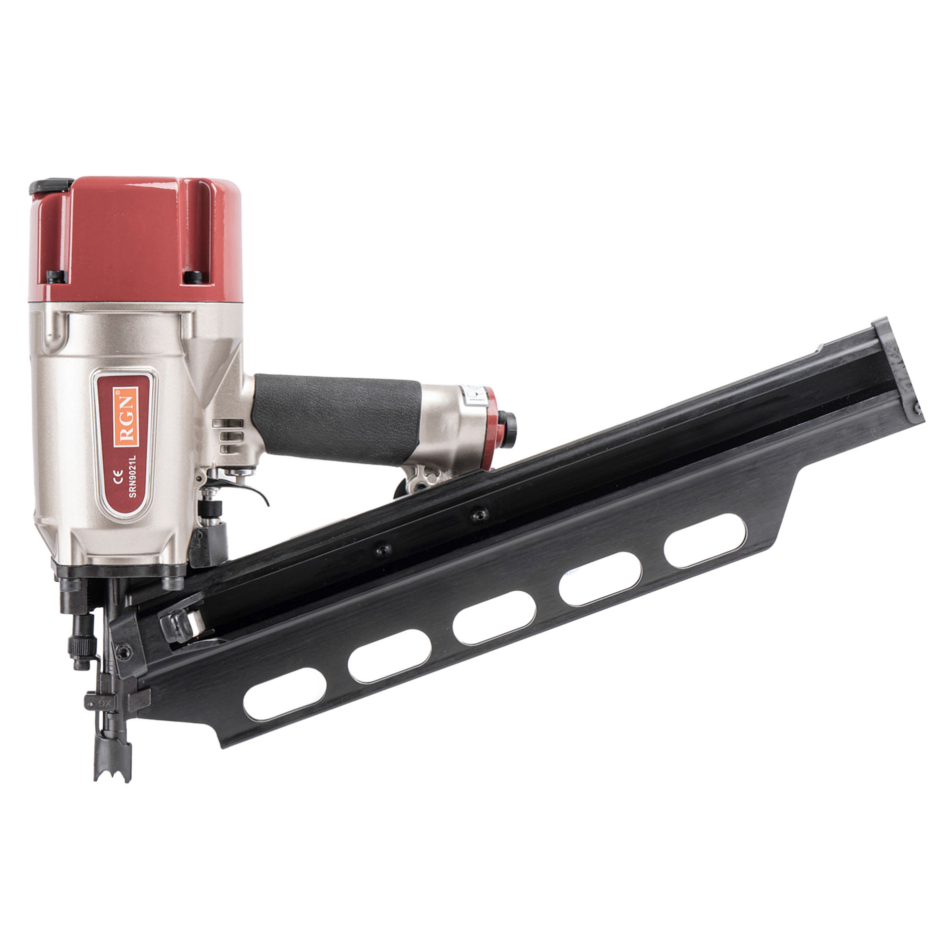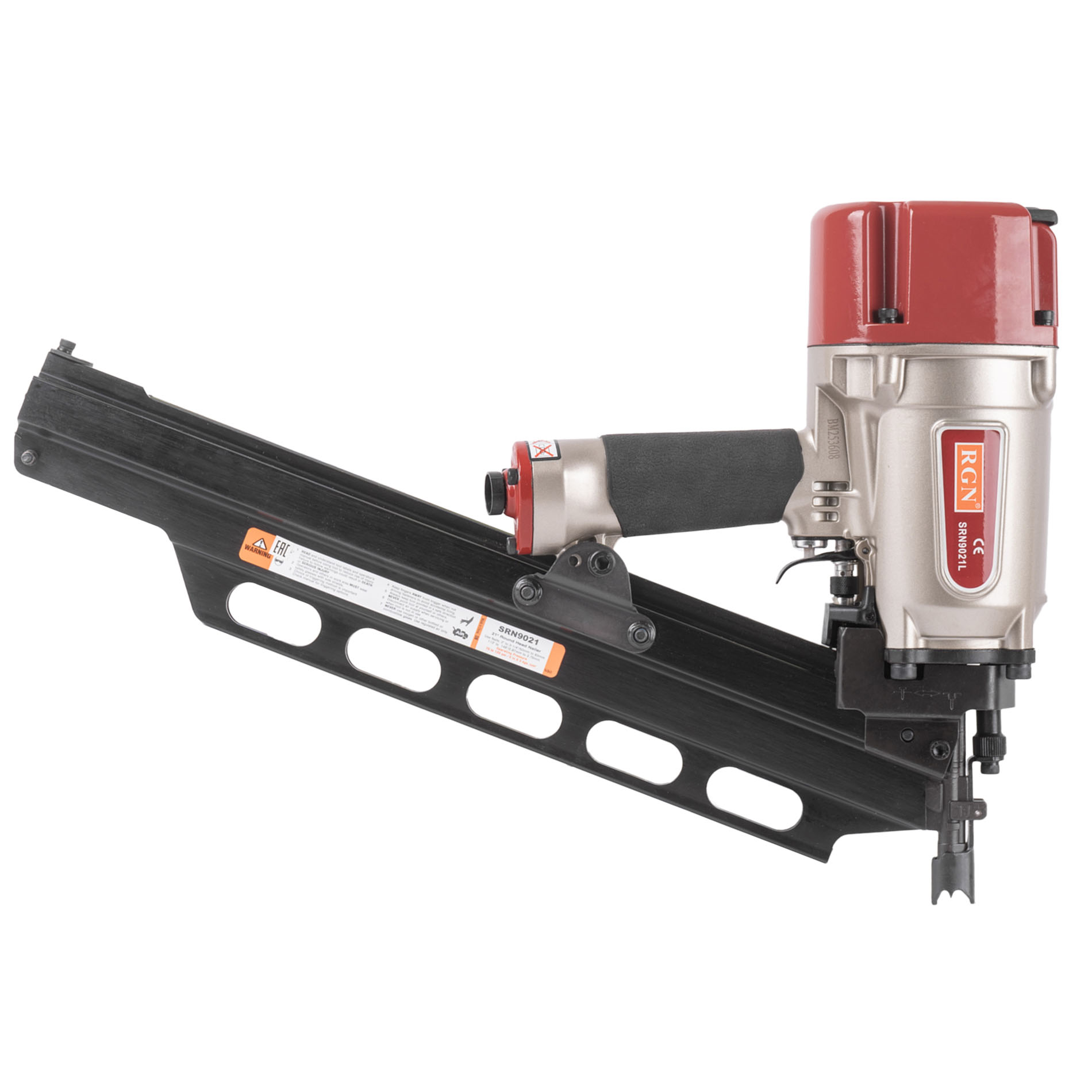 Гвоздезабивной пневматический реечный пистолет RGN SRN9021L для реечных гвоздей в пластиковой обойме с углом наклона 21° и длиной 50-83 мм. Инструмент идеально подойдет для применения в деревянном и каркасном домостроении. Емкость реечного магазина 70 гвоздей, это сравнительно немного и именно поэтому масса снаряженного гвоздями пистолета невелика, что позволяет чрезвычайно удобно оперировать им в труднодоступных местах, в неудобном положении и на вытянутых руках. Инструмент чрезвычайно надежен и прост, его эксплуатация не требует специальных знаний и навыков. Зубчатые зацепы носика предотвращающие его "соскальзывание" с пристреливаемой поверхности, контактный предохранитель исключающий случайный выстрел, регулировка глубины забивания.