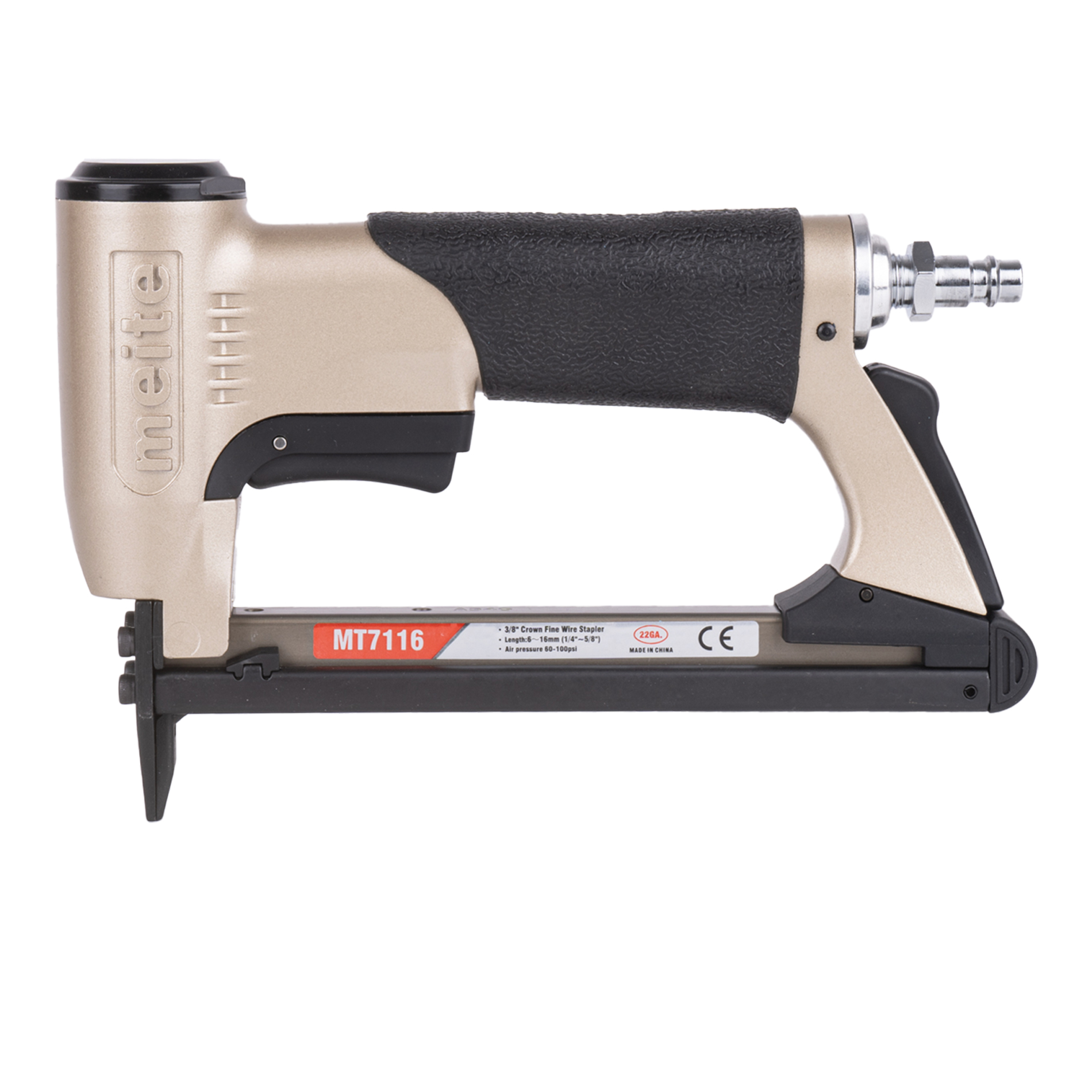 Обивочный пневматический степлер meite (майте) MT7116 GBA34G00301 - это профессиональный скобозабивной пневмопистолет для мебели. Идельно подойдет для обивки тканью на производство мягкой мебели. Использует скобу наименьшей толщины и применим для скорняжных работ. Используются мебельные обивочные скобы 22GA, тип 71 (V), Omer 3G, длина скобы 6-16 мм, ширина спинки скобы 9.1 мм, сечение проволоки 0.75x0.58 мм. За счет использования скоб более тонкого сечения Вместимость обоймы достигает 190 скоб, что позволяет реже менять обойму и экономить на крепеже. Небольшой вес, размеры и удобная эргономическая прорезиненная рукоятка делают эксплуатацию инструмента максимально комфортной и безопасной. Инструмент простой, надежный и крайне производительный, не требует специальных знаний и навыков. Наилучшее соотношение цены и высокого качества исполнения.