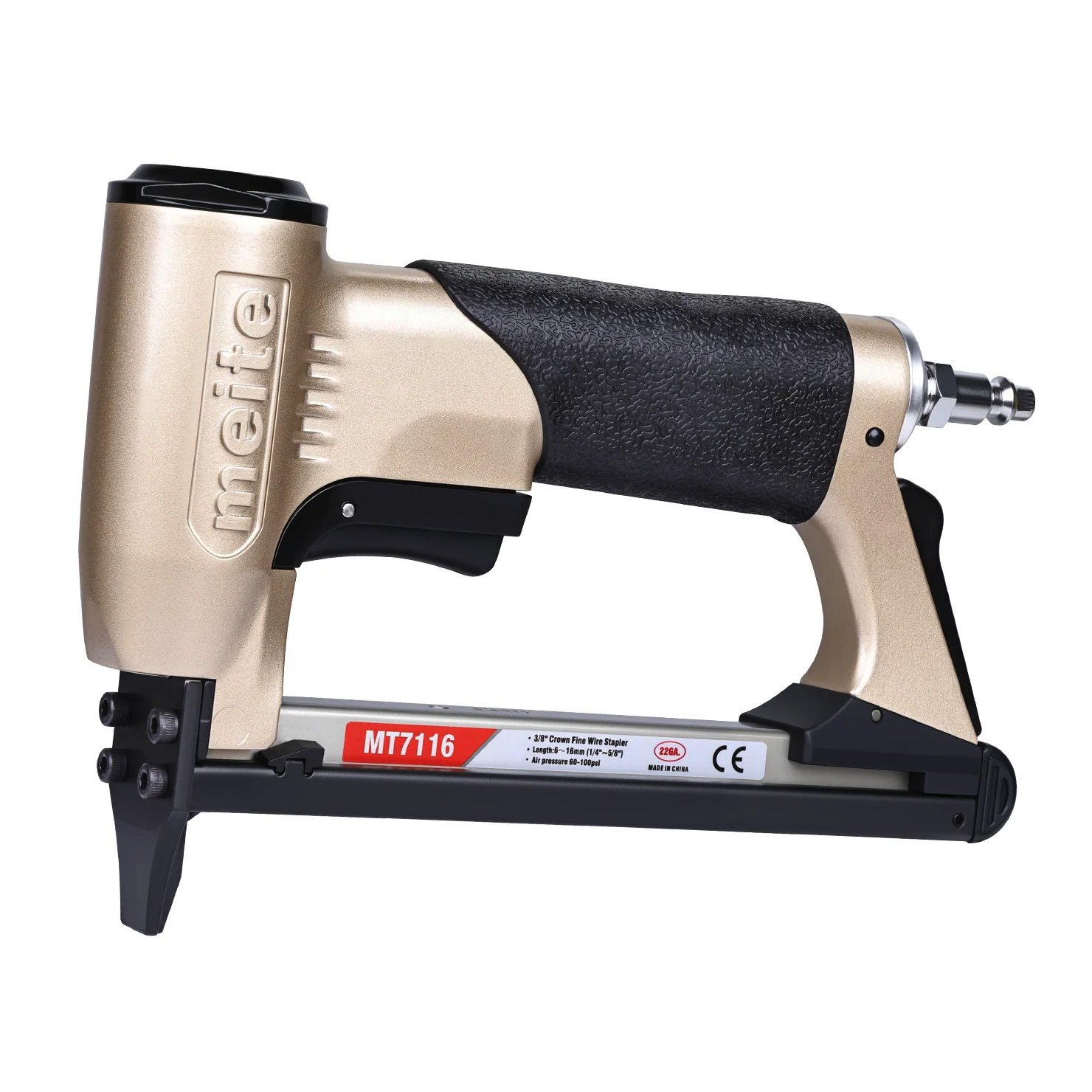 Обивочный пневматический степлер meite (майте) MT7116 GBA34G00301 - это профессиональный скобозабивной пневмопистолет для мебели. Идельно подойдет для обивки тканью на производство мягкой мебели, а также в строительстве для фиксации пленок и мембран. Используются мебельные обивочные скобы 22GA, тип 71 (V), Omer 3G, длина скобы 6-16 мм, ширина спинки скобы 9 мм, сечение проволоки 0.75x0.6 мм. За счет использования скоб более тонкого сечения Вместимость обоймы достигает 190 скоб, что позволяет реже менять обойму и экономить на крепеже. Небольшой вес, размеры и удобная эргономическая прорезиненная рукоятка делают эксплуатацию инструмента максимально комфортной и безопасной. Инструмент простой, надежный и крайне производительный, не требует специальных знаний и навыков. Наилучшее соотношение цены и высокого качества исполнения.